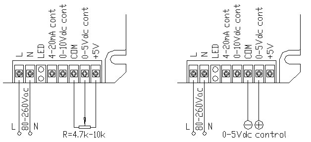 ④、4-20mA控制方式:按圖示,可接受溫控表等的4-20mA模擬信號,模塊內(nèi)部4-20mA端相對com端的輸入阻抗為250Ω。采用此方式時‘0-10Vdc’端與+5V端和cont端懸空。