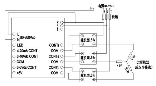 觸發(fā)器TSR可以驅(qū)動從幾十安到數(shù)百安的全系列規(guī)格的隨機型固態(tài)繼電器,組成簡單經(jīng)濟的三相調(diào)壓系統(tǒng),此方案一般用于大功率調(diào)壓系統(tǒng)。對于150A規(guī)格以下場合,可選用三相一體化調(diào)壓模塊。