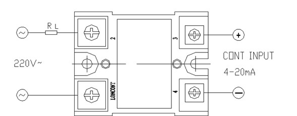 調壓器內部①②端為可控硅電路,分為雙向可控硅普通型、單相可控硅反并增強型和單相可控硅半波型。其中半波型只對交流電壓的正半周調壓(模塊內部單向可控硅的陽極接①端,陰極接②端)。③④端為4-20mA控制輸入,③端接正極,④端接負極,可以與溫控表或PLC等的4-20mA輸出控制端口匹配。調壓器輸出電壓隨著控制信號的強弱而線性變化。