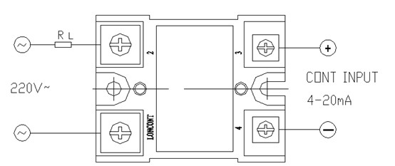 調(diào)壓器內(nèi)部①②端為可控硅電路,分為雙向可控硅普通型、單相可控硅反并增強型和單相可控硅半波型。其中半波型只對交流電壓的正半周調(diào)壓(模塊內(nèi)部單向可控硅的陽極接①端,陰極接②端)。③④端為4-20mA控制輸入,③端接正極,④端接負極,可以與溫控表或PLC等的4-20mA輸出控制端口匹配。調(diào)壓器輸出電壓隨著控制信號的強弱而線性變化。