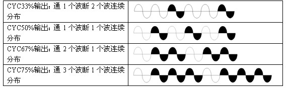 8、輸出CYC方式:負(fù)載電流按正弦波均勻通斷分布調(diào)功模塊