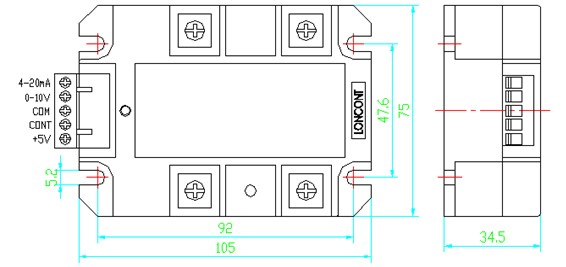 ②、0-5Vdc控制方式:按圖示,可接受單片機(jī)等的0-5Vdc模擬信號,控制輸入正極接cont端、負(fù)極接com端,模塊內(nèi)部cont端相對com端的輸入阻抗大于30KΩ。當(dāng)控制端cont從0-5Vdc改變時,交流負(fù)載上的電壓從0伏到最大值線性可調(diào),其中cont在0-0.7Vdc左右時為全關(guān)閉區(qū)域,可靠關(guān)斷整個電路的輸出;cont在0.7Vdc-4.3Vdc左右為可調(diào)區(qū)域,即隨著控制電壓的增大,交流負(fù)載上的電壓從0伏增大到最大值;cont在4.3Vdc-5Vdc左右時為全開通區(qū)域,交流負(fù)載上的電壓為最大值(接近電網(wǎng)電壓)。