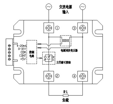 模塊內(nèi)部①②端為可控硅電路,分為一只雙向可控硅的普通型、兩只單相可控硅反并聯(lián)的增強(qiáng)型。模塊內(nèi)部③④端為導(dǎo)線直通端,內(nèi)部①③端之間接有電源同步變壓器。