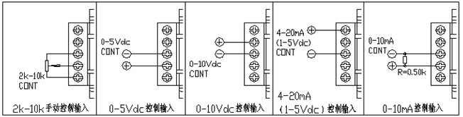 ⑤、0-10mA控制方式:按圖示,采用此方式時(shí)須在模塊cont端與com端之間接一只500Ω、1/2W電阻,當(dāng)輸入0mA時(shí)cont端為0Vdc,當(dāng)輸入10mA時(shí)cont端為5Vdc。