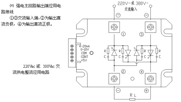 ④、4-20mA控制方式:按圖示,可接受4-20mA模擬信號(hào),模塊內(nèi)部4-20mA端相對(duì)com端的輸入阻抗為250Ω。當(dāng)以4-20mA控制輸入時(shí),4-5mA左右時(shí)為全關(guān)閉區(qū)域,可靠關(guān)斷整個(gè)電路的輸出;5-19mA左右為可調(diào)區(qū)域,即隨著控制電流的增大,移相角α從180°到0°線性減小,負(fù)載上的電壓從0伏增大到最大值;19-20mA左右時(shí)為全開通區(qū)域,輸出最大。