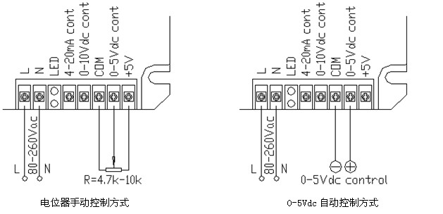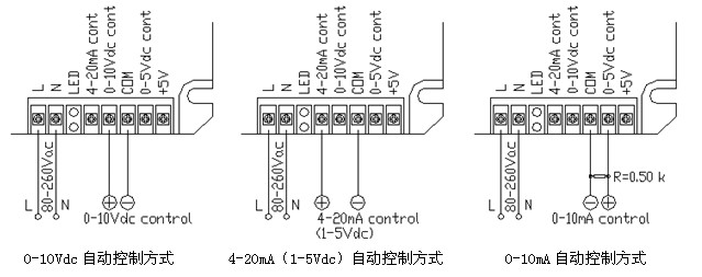 ③、0-10Vdc控制方式:按圖示,可接受0-10Vdc模擬信號(hào),模塊內(nèi)部0-10Vdc端相對(duì)com端的輸入阻抗大于15KΩ。
