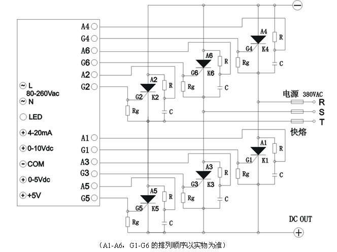 4、三相觸發(fā)器的觸發(fā)端(如A1、G1,……,A6、G6)為單寬脈沖強(qiáng)觸發(fā)方式,可以觸發(fā)額定電流1500A以內(nèi)的任何單向可控硅。強(qiáng)觸發(fā)方式的連線為A1、G1對(duì)應(yīng) KPl的陽極和門極,而不是變壓器驅(qū)動(dòng)方式用的陰極和門極。