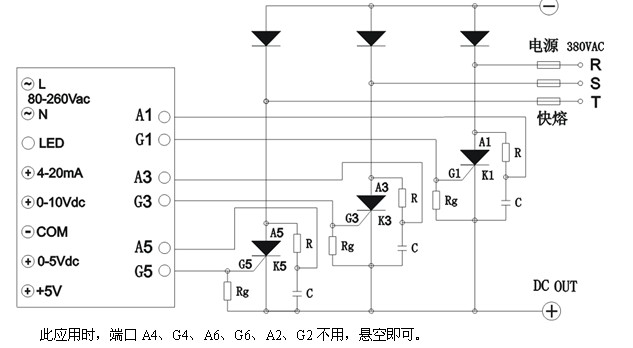 7、觸發(fā)器可以驅(qū)動(dòng)從幾十安到千余安的全系列規(guī)格的單相可控硅,組成簡(jiǎn)單經(jīng)濟(jì)的三相整流調(diào)壓系統(tǒng),此方案一般用于大于150A規(guī)格的大功率調(diào)壓系統(tǒng)。對(duì)于150A規(guī)格以下場(chǎng)合,可選用LSC-TH3P系列三相一體化整流調(diào)壓模塊。