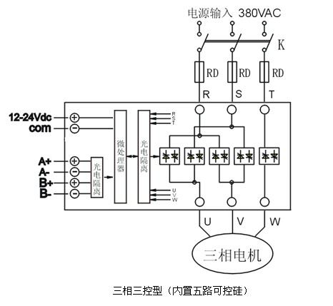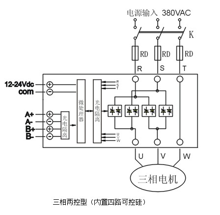3、三相兩控型內置四路可控硅,其中第五路為導線直接接通,當模塊關斷時,380Vac交流強電將仍然直接接入電動機內,敬請留意。