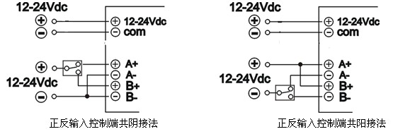 注:A、B正反控制端與電源輸入端之間也為光電隔離,COM端和A-、B-端可以連接或不連接。
