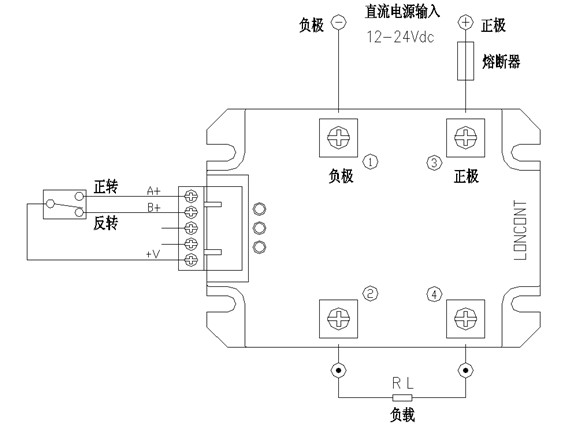 ①和③腳為電源輸入的負(fù)極和正極,②④腳接直流電機(jī)負(fù)載。必要時可接入快速熔斷器