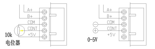 ㈧A型模塊配有調(diào)速功能,在正反切換的同時,可對電機(jī)進(jìn)行雙向速度的10k電位器的手動調(diào)節(jié)或0-5V電壓的自動調(diào)節(jié),cont端的電壓越高則電機(jī)轉(zhuǎn)速越快,還可實現(xiàn)電機(jī)的緩啟動和緩?fù)V埂?/span>